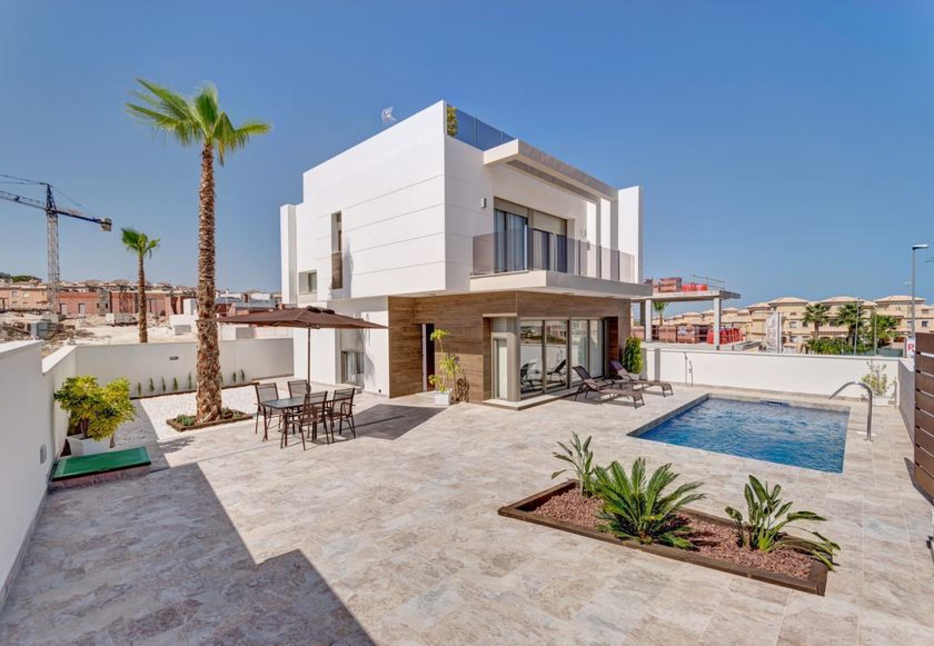 Villa gelegen te Villamartin – Orihuela Costa aan de Costa Blanca zuid in Spanje. Villa voorzien van 3 Slaapkamers en 3 Badkamers, privaat zwembad en parkeerplaats binnen domein. Deze moderne villa’s met 3 slaapkamers en 3 badkamers combineren een nieuw concept van stijl, design en kwaliteit. Ze bieden eenvoudige lijnen en creëren verbluffende en elegante woningen in de buurt van de prestigieuze golfbaan Villamartin.